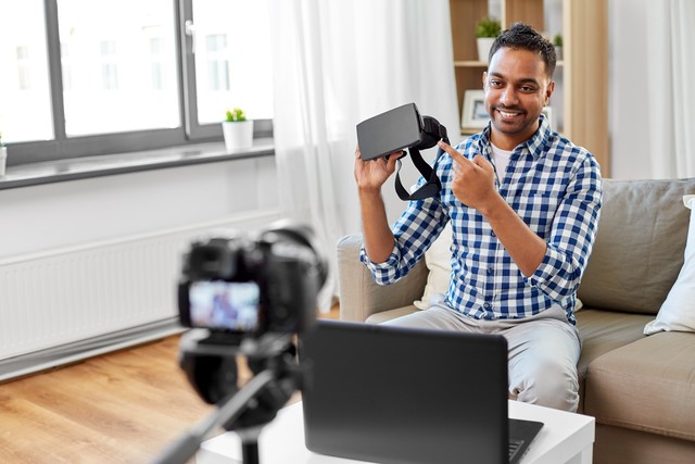 blogging, videoblog and people concept - indian male blogger with camera recording video review of vr glasses at home. male blogger with vr glasses videoblogging at home