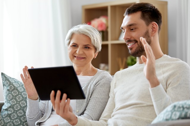 family, generation and people concept - happy smiling senior mother and adult son having video chat on tablet computer at home. old mother and adult son with tablet pc at home