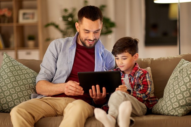 family, fatherhood and technology concept - happy father and little son with tablet pc computer and earphones listening to music at home in evening. father and son listening to music on tablet pc