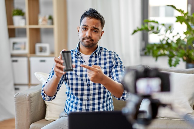 blogging, videoblog and people concept - sad disappointed indian male blogger with camera recording video review of smartphone at home. male blogger with smartphone videoblogging