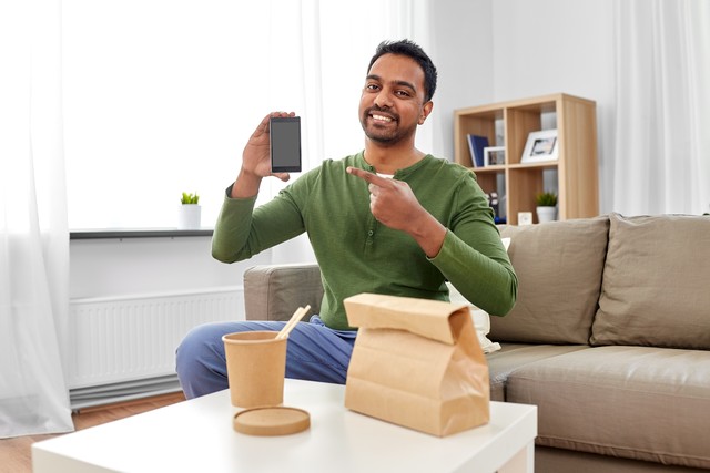 technology, consumption and people concept - smiling indian man using smartphone for food delivery at home. indian man using smartphone for food delivery