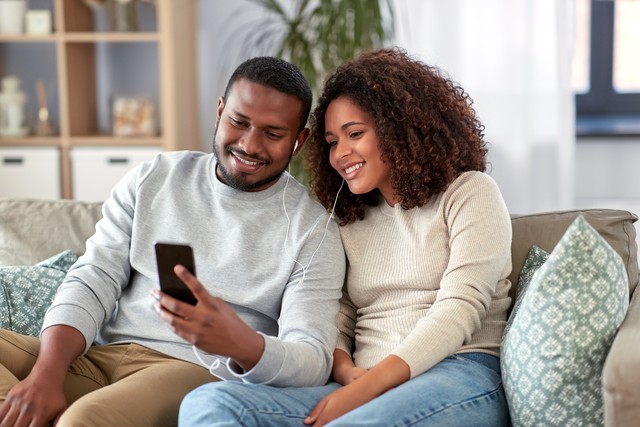 technology, music and people concept - happy african american couple with smartphone and earphones at home. happy couple with smartphone and earphones at home