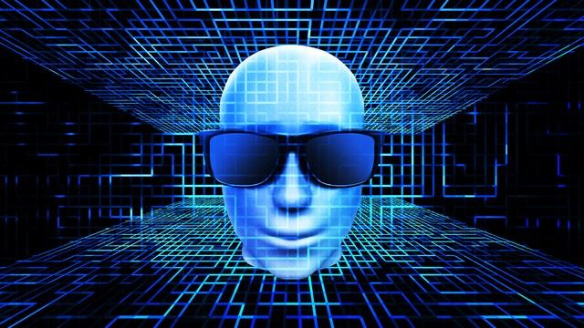 AI人工智能概念数字技术背景,3D渲染戴墨镜的人头在蓝色色电路板线路空间上。