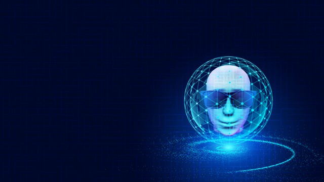 3D渲染戴墨镜的头部,AI人工智能概念数字技术创意背景。