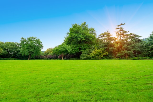 阳光树林与绿草坪绿草地