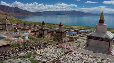 航拍西藏318国道旁雪山下的碧绿色然乌湖