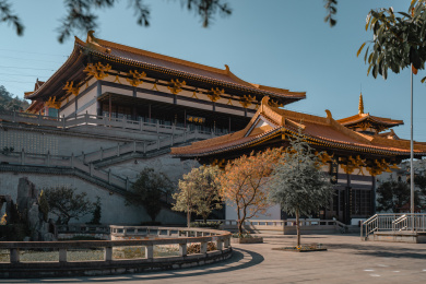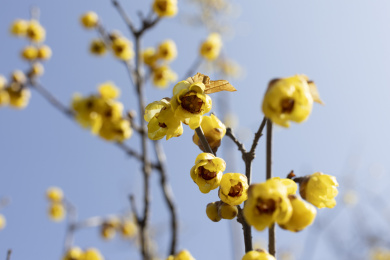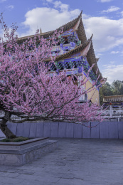 中国云南昆明棋盘宫蓝天白云衬托梅花盛开