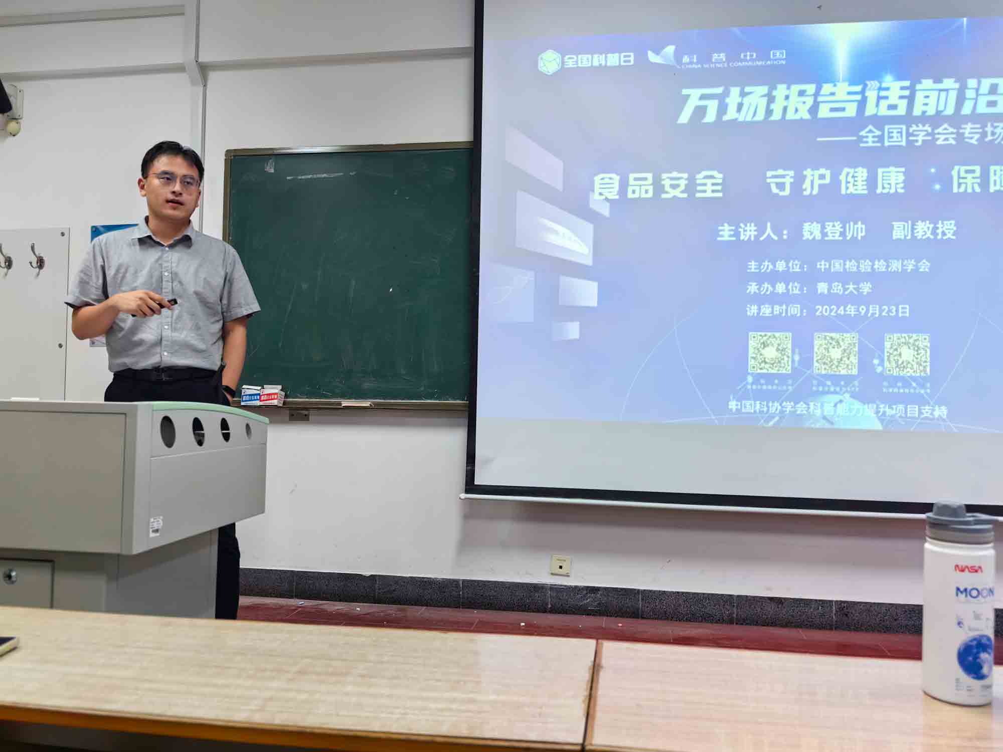 中国检验检测学会邀请青岛大学魏登帅副教授,面向在校150余名大学生以《食品安全:守护健康,保障生活》为题进行科普宣讲,主要围绕食品安全概述、食品安全风险与危害、食品安全标准与规范、食品安全监管与检测、食品安全宣传教育与培训、食品安全问题应对与处理等六大板块讲解。