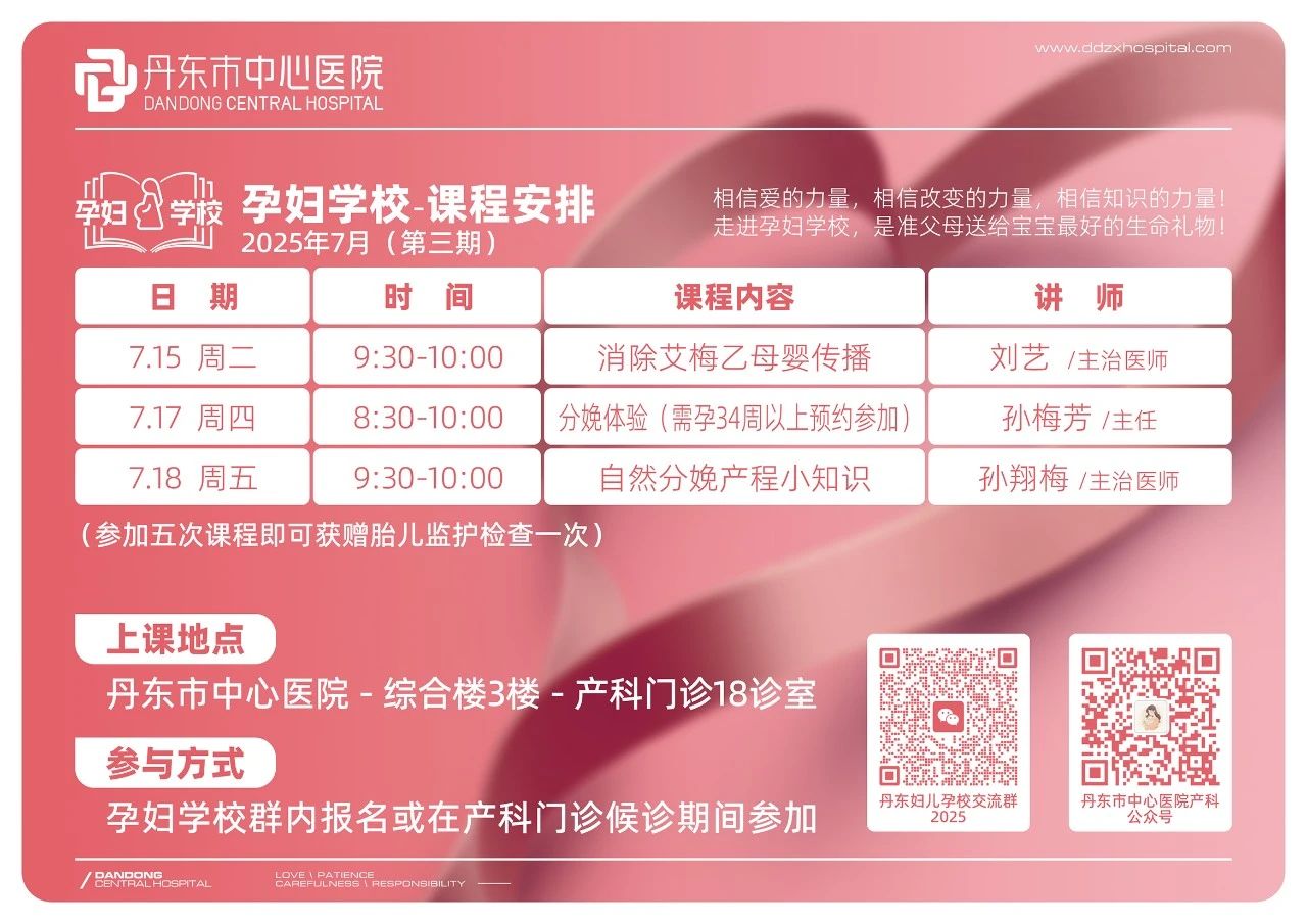亲爱的准妈妈,准爸爸及家属,想要了解更多孕期知识,为顺利分娩做好充分的准备吗?想要学习科学育儿技巧,成为称职的新手爸妈吗?快来参加我们的孕校课堂吧!我们将为您提供靠谱的孕产知识,面对面专家答疑,陪伴您的整个孕期,分担您的焦虑!所有课程均免费哦!
