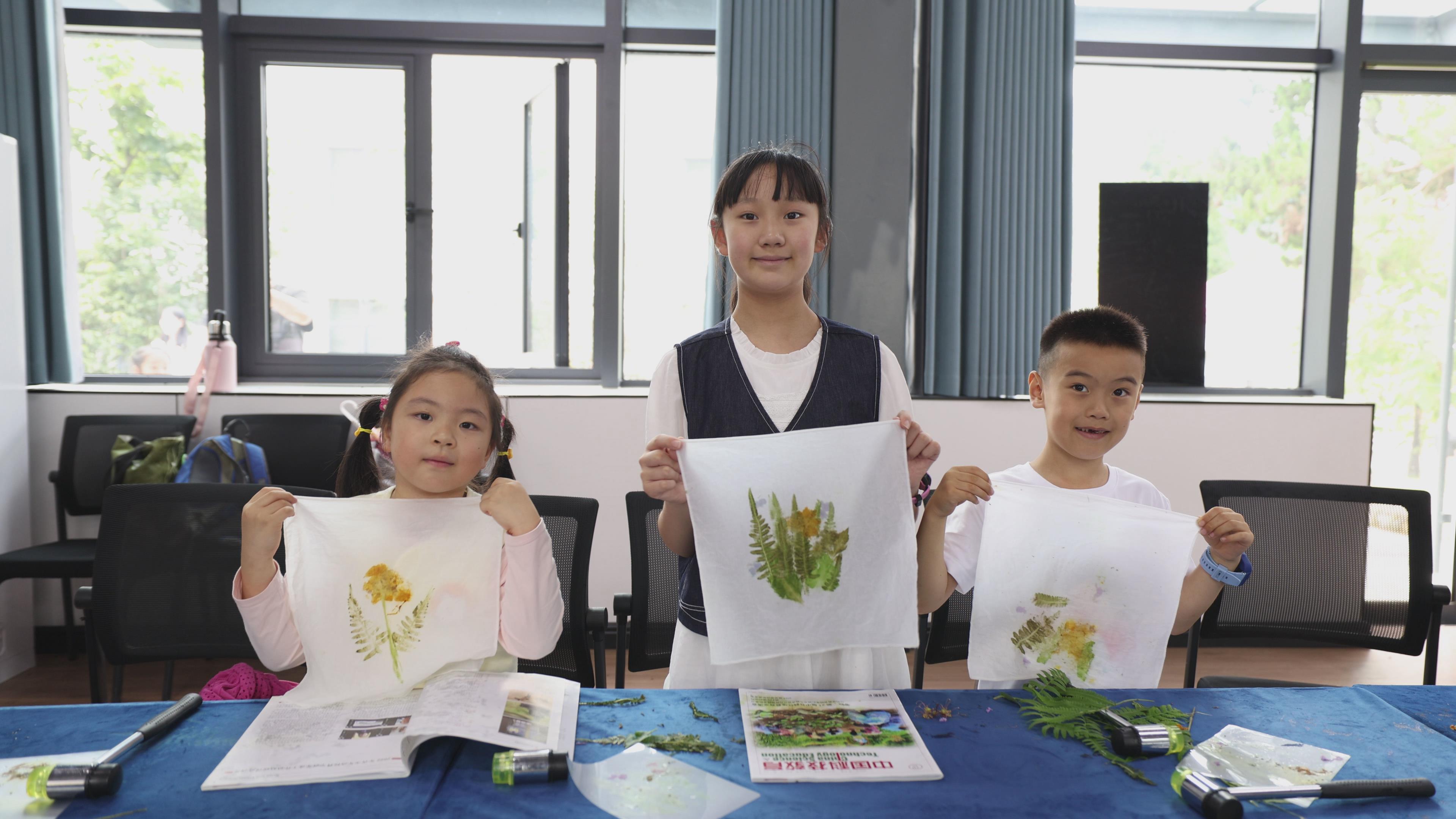 2、植物拓染魔法课堂:学习古老的植物拓染技艺,了解其原理。导师示范如何安全有效地摆放植物、覆盖棉布、细心敲打,让植物的汁液与形态完美转印。