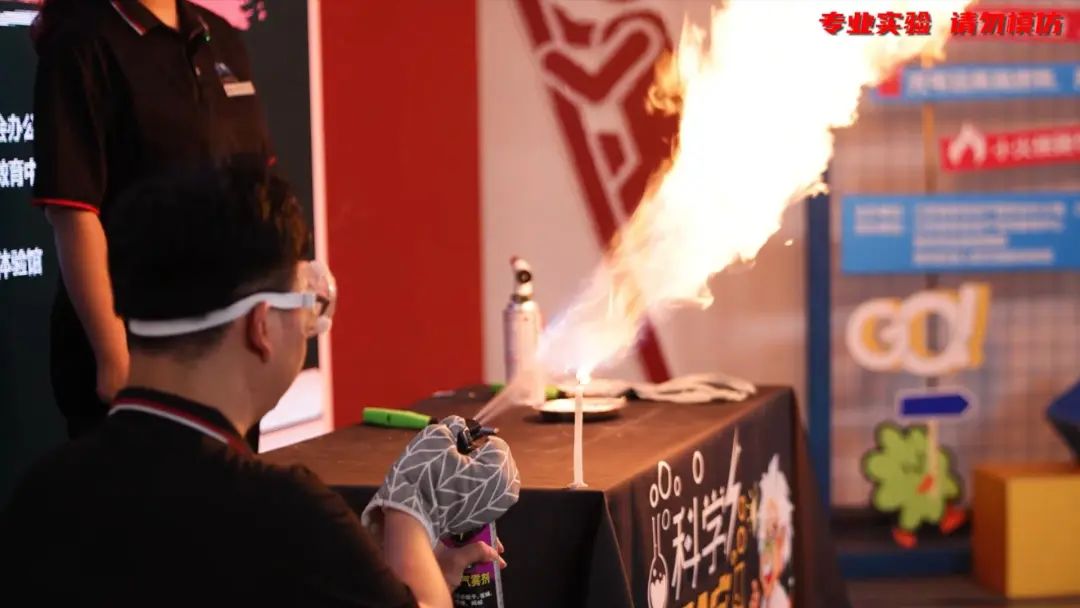 通过实验直观感受危险“近在咫尺”是此次公开课的一大亮点。无锡江阴科技馆的两位安全老师给同学们带来了杀虫喷雾剂和面粉的“火之舞”实验。杀虫喷雾剂遇火瞬间燃起的烈焰、面粉粉尘遇明火的即刻爆燃,让同学们直呼震撼的同时,更深切认识到危险品在错误使用环境下暗藏的风险。
