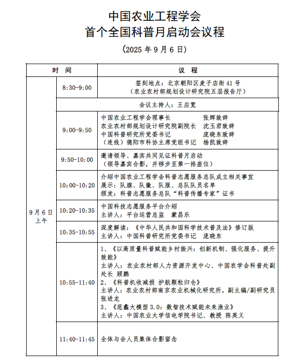 2025 年 9 月 6 日,中国农业工程学会首个全国科普月启动会在北京朝阳区麦子店街 41 号(农业农村部规划设计研究院五层报告厅)举行。
