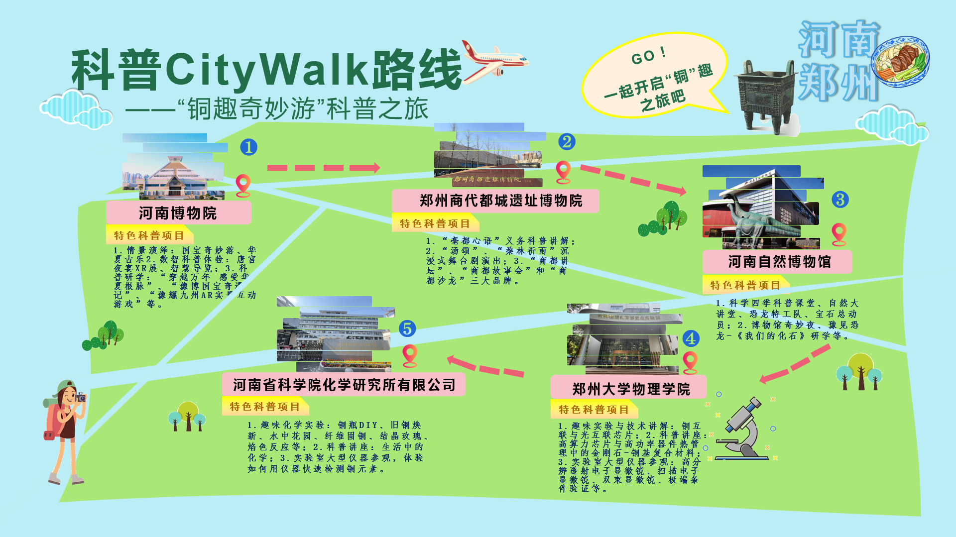 2025年“全国科普月”期间,河南博物院、郑州商代都城遗址博物院、河南自然博物馆、郑州大学物理学院、河南省科学院化学研究所有限公司多家科普教育基地与科学文化场所,共同推出“科普CityWalk”活动,从历史、文化、艺术、工业科技、重大工程等多元角度,开启以“铜趣奇妙游”为主题的科学探索之旅。
