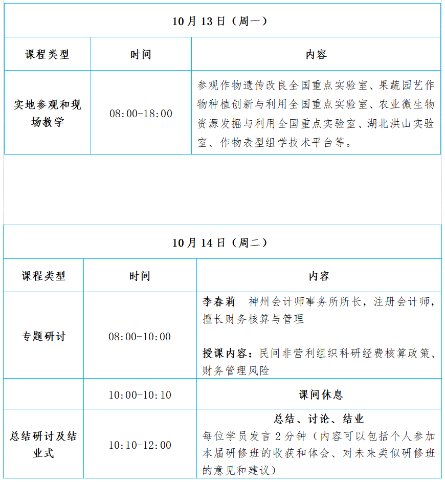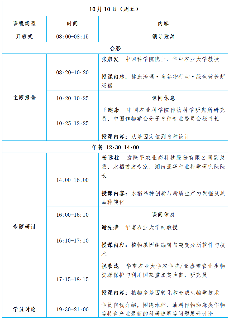 (9)实地参观和分子育种实践:以现场教学方式介绍水稻、油料作物、特色麻类作物新品种育种的流程,参观水稻育种实验基地等。