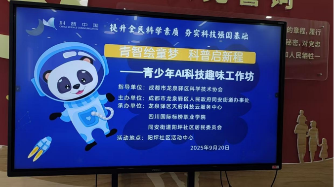 在2025年科普月活动火热开展之际,9月20日,由成都市龙泉驿区科学技术协会指导,成都市龙泉驿区人民政府同安街道办事处主办,龙泉驿区天府科技云服务中心、四川国际标榜职业学院及同安街道阳坪社区居民委员会承办的“青智绘童梦 科普启新程”在阳坪社区活动中心圆满举行。活动以“提升全民科学素质,夯实科技强国基础”为主题,吸引众多青少年参与,气氛热烈。