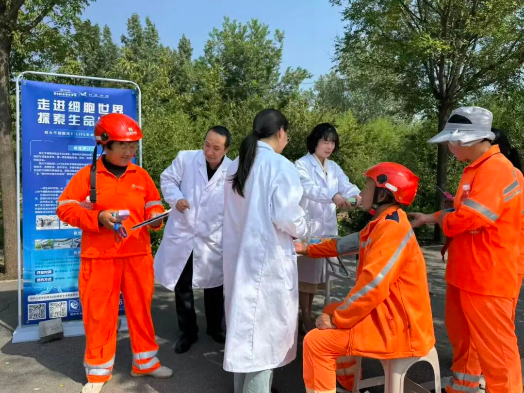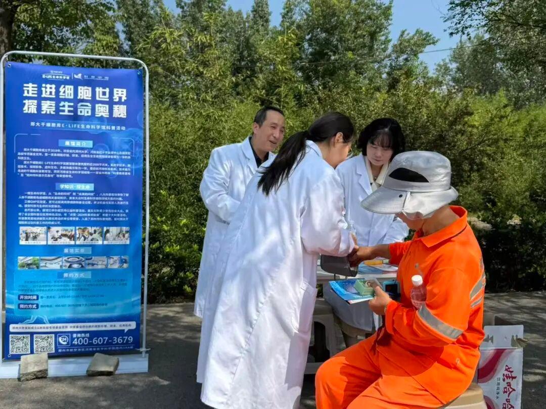 9月30日上午,在国庆、中秋双节来临之际,郑大干细胞库E·LiFE生命科学馆科普团队走进郑州航空港区龙王办事处,开展"情暖双节·健康同行"公益活动,为辖区环卫工人提供健康检测、科普咨询及爱心物资,以实际行动践行科技惠民理念。