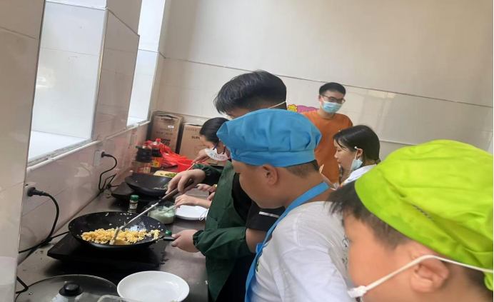 活动注重实践与文化的双向赋能。在食育厨房,“小小厨师”系着围裙、手持锅铲,在营养师和亨饪老师的指导下,亲手完成辣椒炒鸡蛋、蛋炒饭等。“原来做一道菜要这么多步骤,以后再也不浪费粮食了!”在“成果分享”环节,学生们品尝着自己做的菜,纷纷发出这样的感慨。
