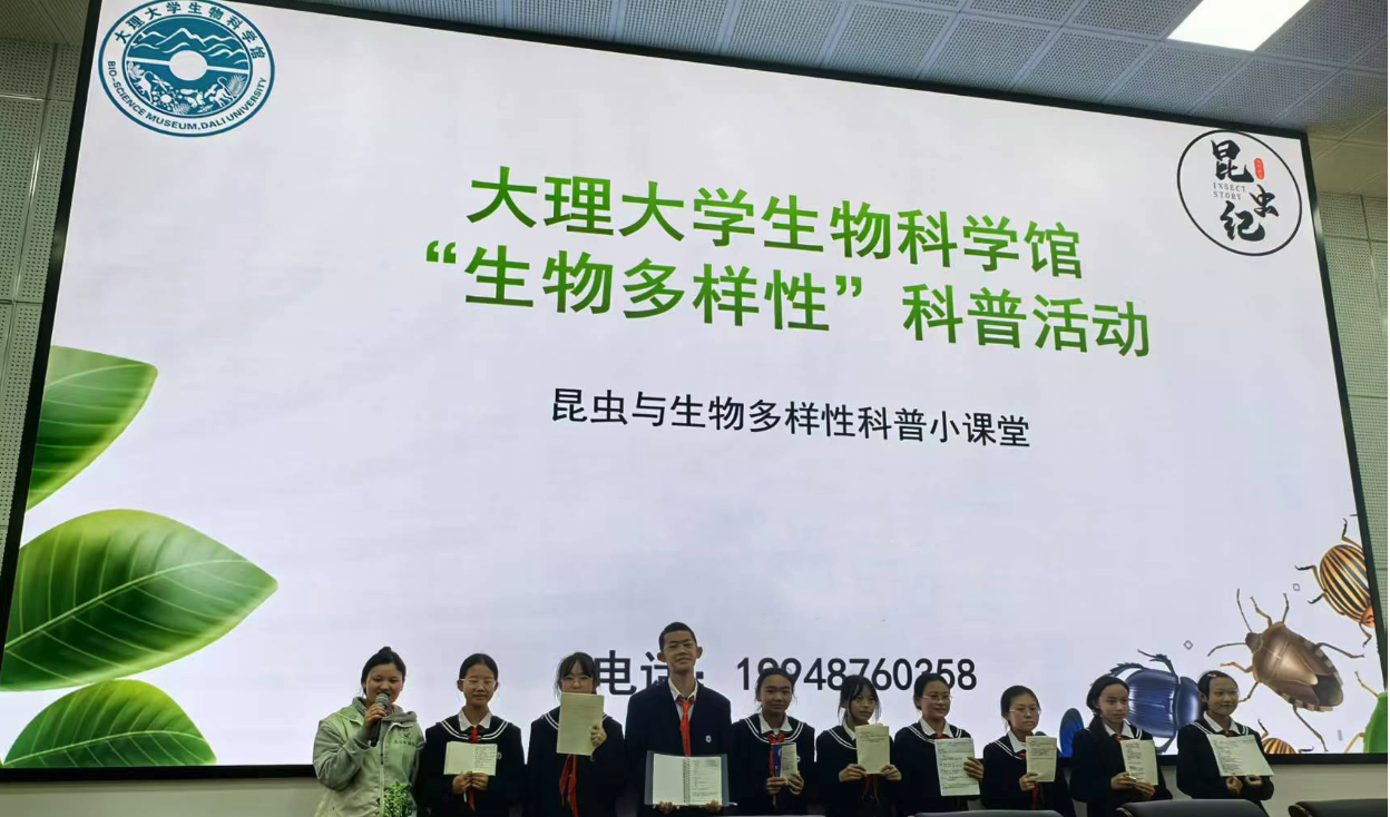 活动伊始,馆内志愿者同学和老师为同学们带来了生动有趣的昆虫和生物多样性科普进校园讲座。他们从西南地区尤其是大理苍山洱海独特的生态特点切入,为师生们介绍了丰富多样的生物种类,让大家对生物多样性保护的内涵与价值有了深入了解。同时,我们的志愿者还给同学们发放了科普宣传页,涵盖植物、动物和真菌三类,以简洁明了、图文并茂的形式,方便师生随时查阅学习,助力巩固生物多样性知识。