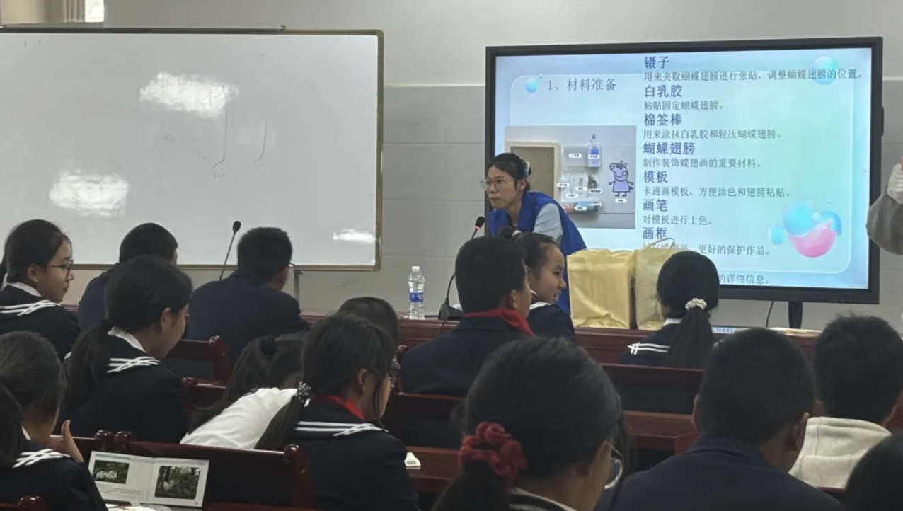 互动体验环节,科普志愿者和老师带领同学们进行植物拼贴画手工和非遗蝶翅画的个性创作。同学们发挥创意,用多样的植物材料、蝶翅等巧妙组合,创作出一幅幅充满想象力的作品。在创作过程中,大家不仅增进了对植物形态、色彩等特征的认识,还亲身感受到植物之美与生物多样性的独特魅力。