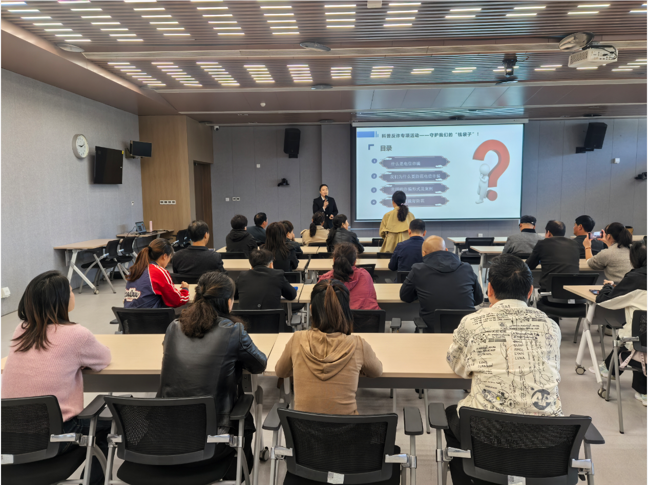 培训开始后,反诈讲师借助PPT和反诈视频,围绕电信诈骗展开讲解。首先明确了电信诈骗的定义,指出通过电话、网络、短信等非接触方式,编造虚假信息诱骗转账的行为均属于此类犯罪;随后阐述了电信诈骗对个人、家庭及社会的危害,用视频案例展示了因防范不当导致的财产损失情况;最后详细介绍了电信诈骗的防范措施,包括不轻易泄露个人信息、不点击可疑链接、不随意转账,以及遇到疑问及时核实等要点。