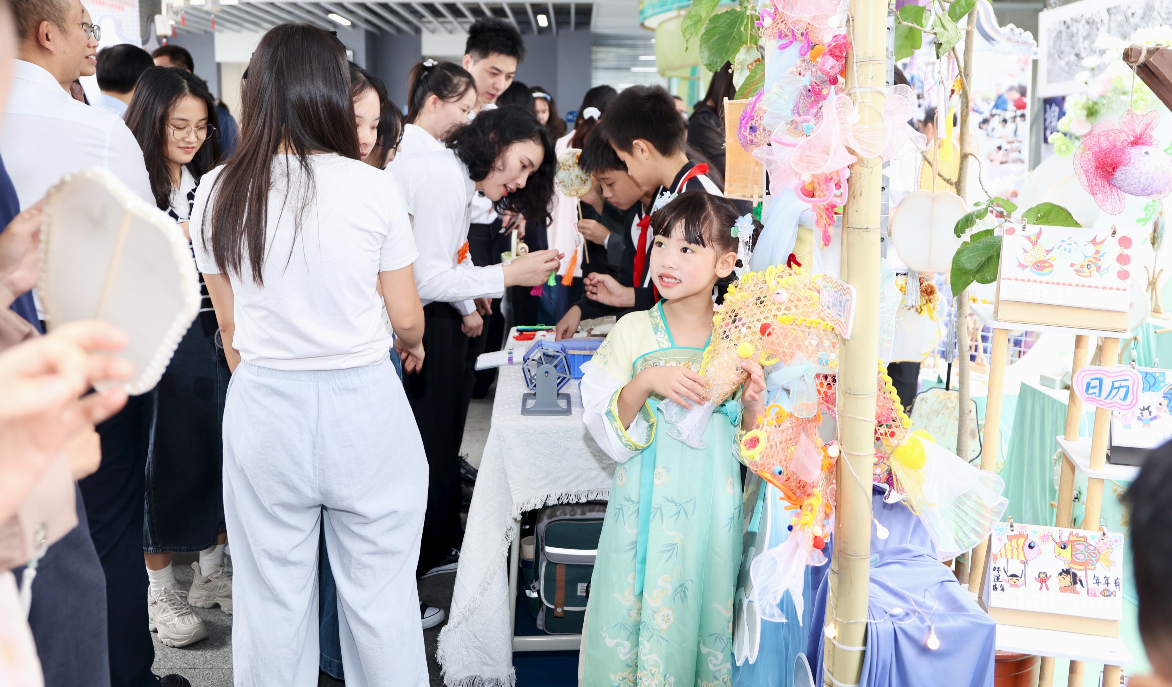 本次活动开场便尽显丰富多元 —— 乐从校园美育文创区率先成为全场焦点。在这里,学生们亲手创作的作品琳琅满目:灵动雅致的扎染,肌理细腻的漆画作品,还有形态各异的陶艺、憨态可掬的泥塑。吴硕贤院士在同学们的带领下走进文创区,与学生们亲切互动;学生们围在院士身旁,热情分享手工作品的创意与制作心得。这些充满童真与创意的作品,不仅生动呈现了乐从校园美育“多元融合、知行合一”的探索成果,更以浓郁的人文之美为整场活动奠定温暖基调。
