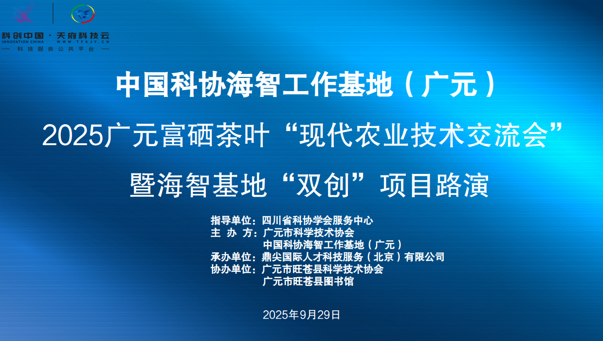 9月29日,2025广元富硒茶叶“现代农业技术交流会”暨海智基地“双创”项目路演在旺苍县圆满举行。本次活动由广元市科学技术协会、中国科协海智工作基地(广元)联合主办,鼎尖国际人才科技服务((北京)有限公司承办,旺苍县科学技术协会、旺苍县图书馆协办。市科协党组书记、主席谭一江出席活动并发表致辞,党组成员、市科技服务中心主任王若凡亦参与其中。