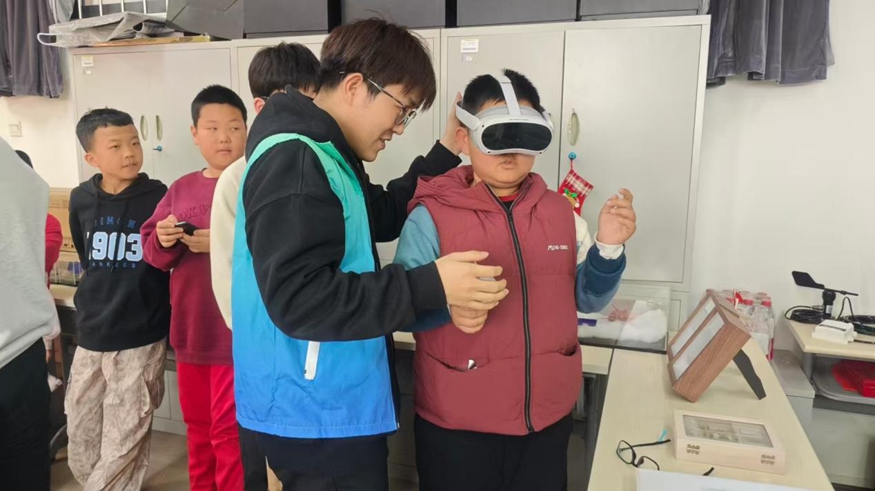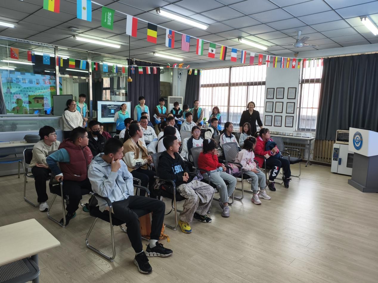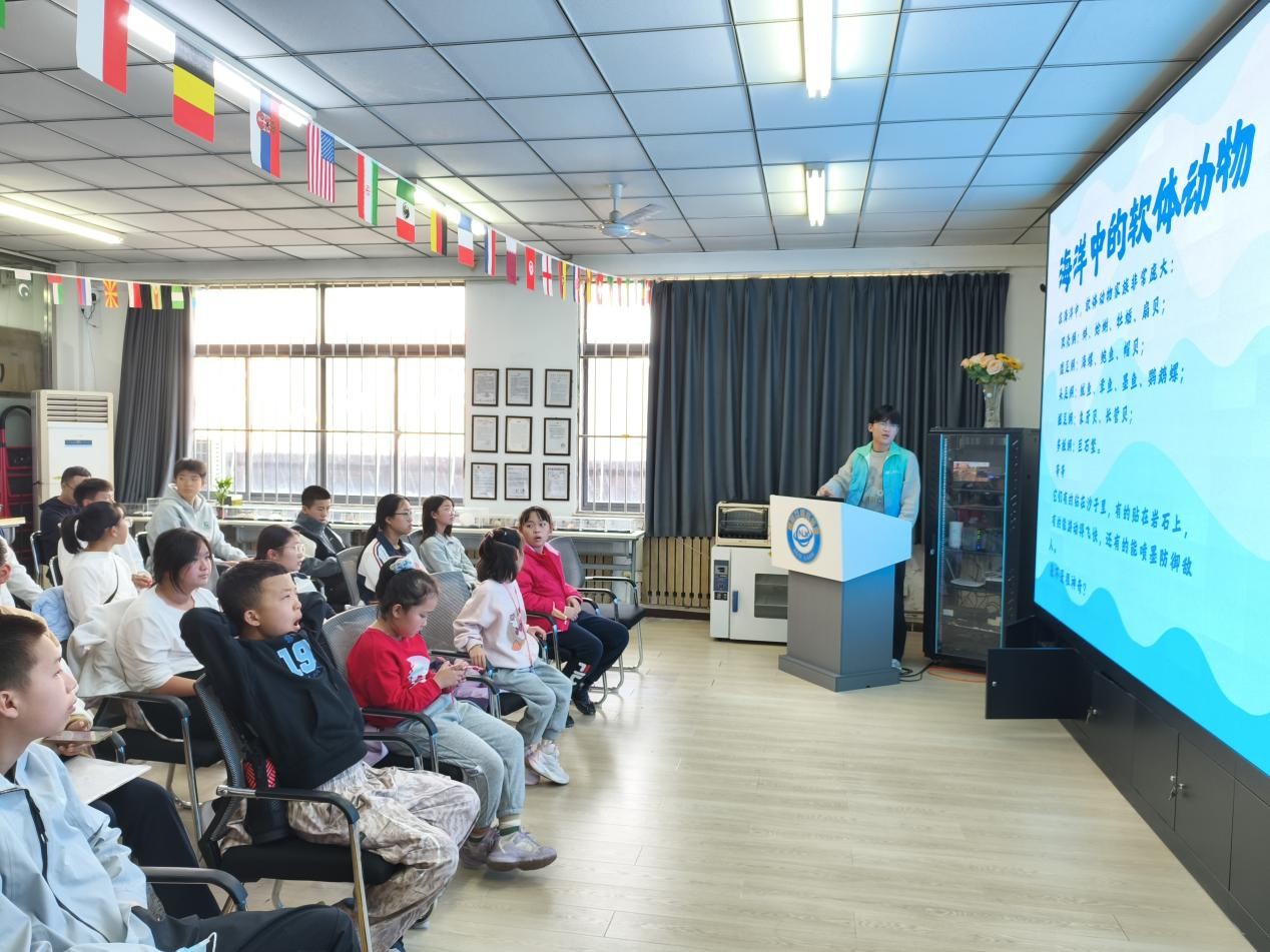 VR虚拟海洋世界体验环节将活动推向高潮。在冯昆、赵学宇等志愿者讲解员的组织下,同学们分为两队沉浸式体验VR设备,仿佛置身奇幻海洋,与海洋生物“近距离接触”;与此同时,孙劳拉、兰吉等志愿者讲解员通过趣味卡片,教同学们简单的西语问候语,在跨文化互动中拓宽了国际视野。有奖问答环节中,同学们踊跃参与,积极回答老师们提出的科技与生态相关问题,并获得了实验室精心准备的研学纪念品,现场气氛热烈。