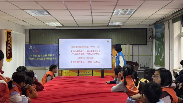 为增强青少年网络安全意识,提升识骗防骗能力,11月8日,丰台区科技科普志愿服务队联合北京市夕阳再晨社会工作服务中心共同走进丰台街道丰益花园社区,开展以“防人之心不可无——电信诈骗”为主题的青少年反诈科普讲座。本次活动围绕电信诈骗的常见类型、识别方法与防范技巧,结合真实案例,帮助青少年筑牢网络安全防线。