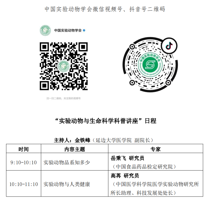 为深入贯彻落实《关于新时代进一步加强科学技术普及工作的意见》《全民科学素质行动规划纲要(2021-2035年)》《中国科协科普发展规划(2021-2025年)》《中国科协关于加强新时代学会科普工作的意见》,中国实验动物学会将于近期举办“实验动物与生命科学科普讲座”,并通过中国实验动物学会微信视频号、抖音号同步线上直播,欢迎参加。