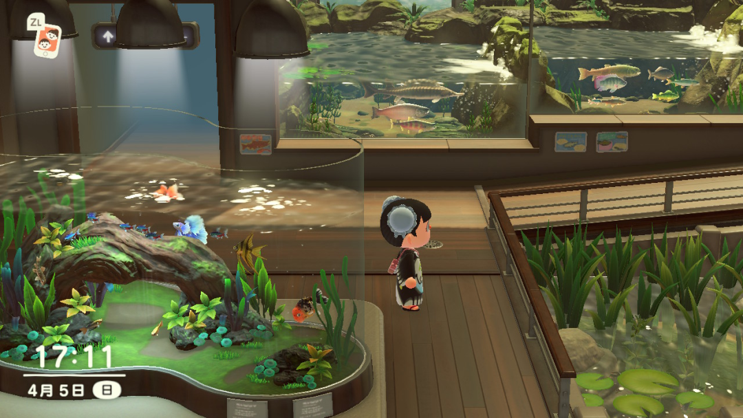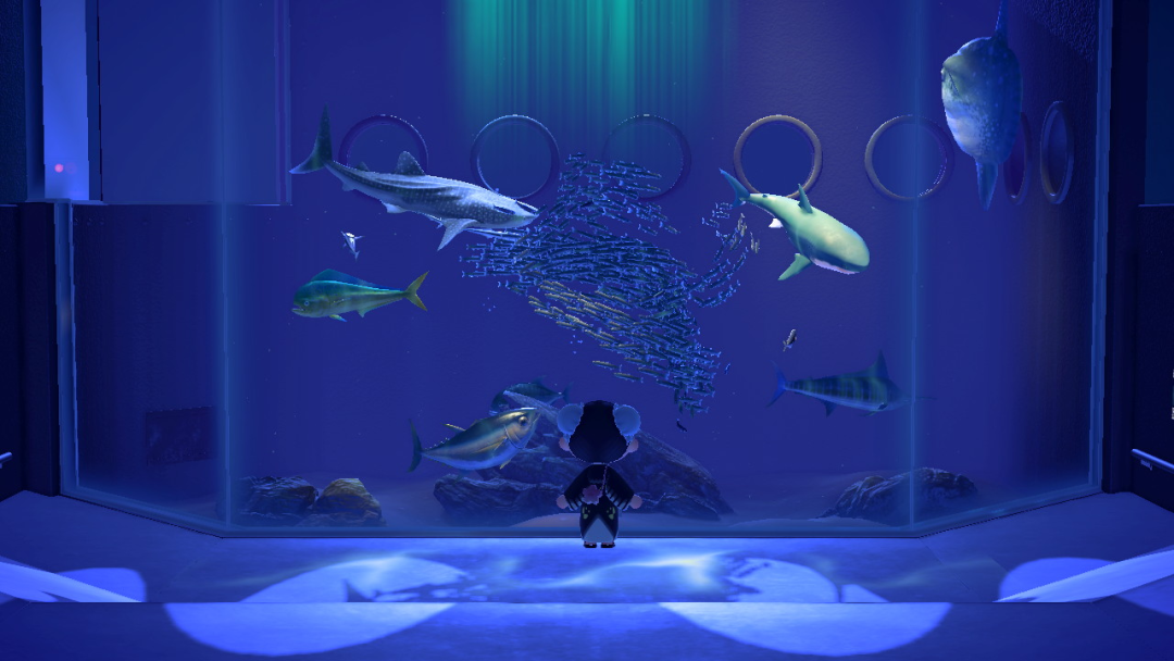 水族馆淡水厅的展示效果。左侧为小型鱼类,包括霓虹灯鱼、孔雀鱼、稻田鱼(青鳉)、金鱼等,远处为河流中生活的鱼,缸子分为三个阶梯,里面分别是游戏设定中入海口、河流和悬崖上可以钓到的鱼。图片:antares