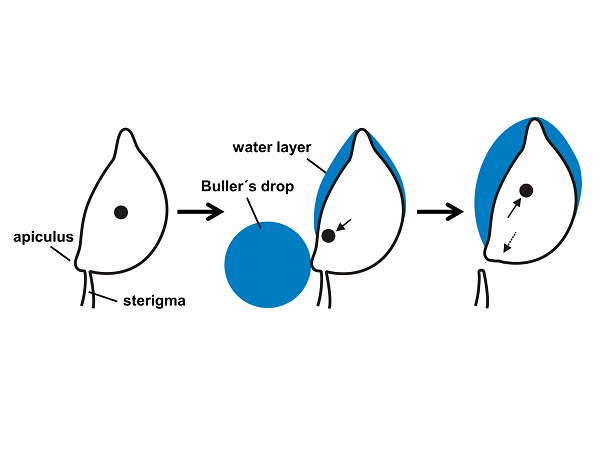 孢子“发射”的示意图。蓝色的液滴消失,使半圆形的孢子弹射出去。图片:M. Piepenbring / Wikimedia Commons