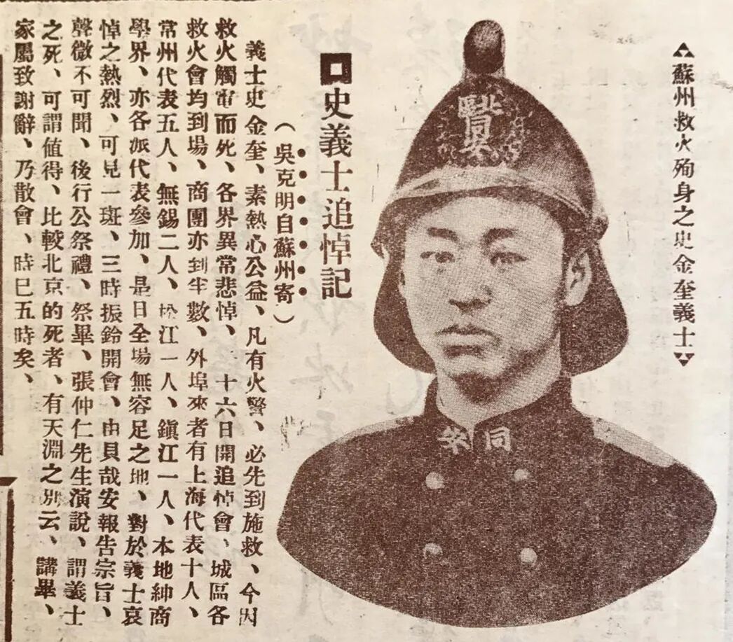 1926年4月5日深夜,苏州城内闾邱坊居民叶家发生火灾,苏州北区十八段救火会员史金奎同居一巷,闻警一人首先赶到火场。