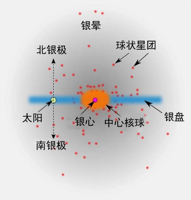 银河系结构。灰色部分就是银晕,它就像轻烟笼罩村庄,但其质量却比银河系内发光物质的质量大得多。图中红色的点都是球状星团,每个球状星团中包含数十万到数千万颗恒星。| 来源:R J Hall;汉化:本文作者