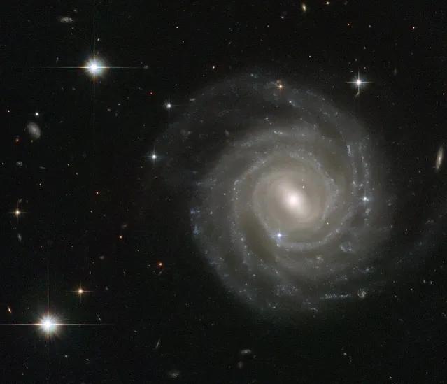 我们身在银河系内,因此无法跳出银河系拍出银河系的俯视图。但沙普利、奥尔特以及其他众多天文学家已经推导出银河系的结构。现在的天文学家认为宇宙中有众多星系与银河系很像,哈勃空间望远镜拍摄的UGC 12158就是其中之一。从图中我们可以看到UGC 12158清晰的旋臂,也可以借此体会到银河系的旋臂结构。这个星系核心左下方一些的位置上的一颗蓝色亮星是超新星SN 2004ef。| 来源:NASA/ESA,HST