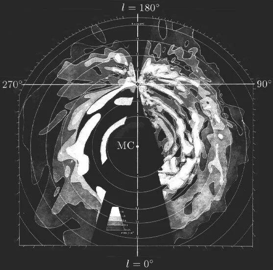 奥尔特与合作者绘制出的银河系射电辐射分布图。|来源:Oort, Westerhout, Kerr MNRAS,1958,18,3797