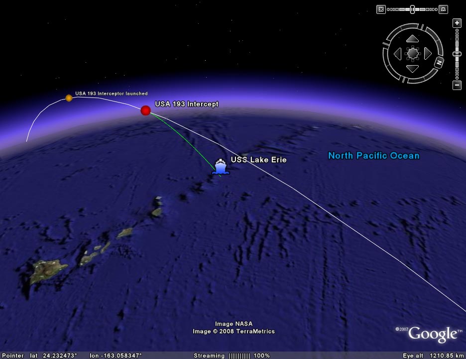 ▲ 美国“伊利湖”号巡洋舰发射经过改装的“标准”3型导弹击毁美国-193卫星的示意图。