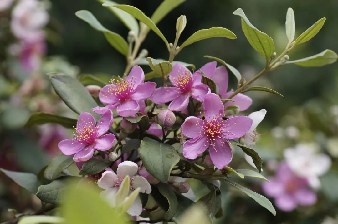 每年四五月份,桃金娘就进入花期了。就如古人所看到的,桃金娘的花与桃花有几份神似,鲜艳的紫红色花瓣搭配金黄的花药,在郁郁葱葱的灌木丛中十分引人注目。所以就算抛开果子不谈,桃金娘凭借花朵的颜值,也能在烂漫春花中占有一席之地。