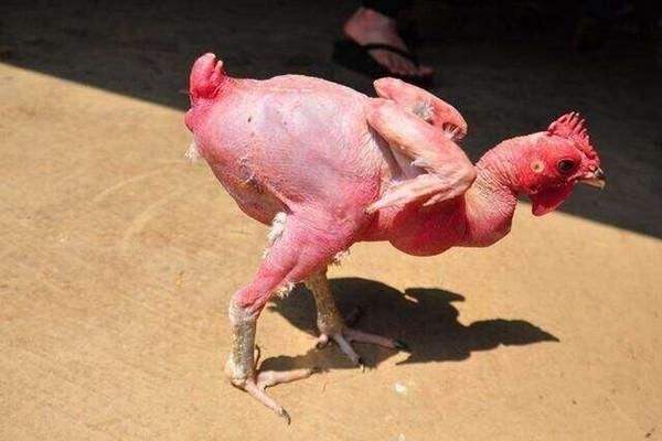 无毛鸡,这也算是网红鸡了,网上流传有关于它的小视频。据说1954年在美国发现了基因突然变异的无毛鸡,以色列的研究者把无毛鸡与普通的鸡交配以后,研制出了这种红色无毛鸡。挺好,下锅都省得拔毛了。