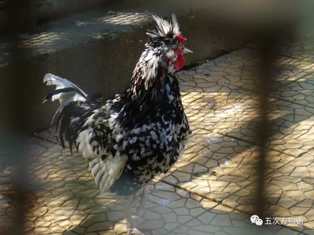 贵妇鸡,亦称贵妃鸡,原产欧洲,青岛动物园曾有展出。此鸡配色新奇,身披蓝黑间白花羽,头上羽毛发达,犹如凤冠霞帔一般,给人以雍容华贵之感。更难能可贵的是,贵妇鸡秀外慧中,不仅颜值上佳,而且肉质鲜美,堪称为“鸡中极品”。