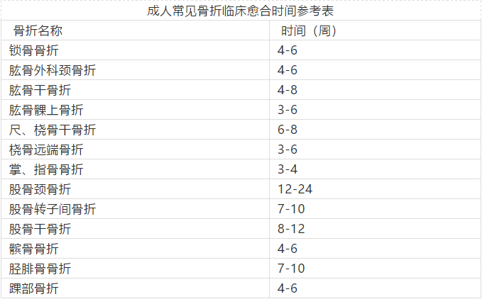 由于不同部位的骨折,其周围血供情况有所不同,医生们根据临床经验总结出了一般成人骨折部位愈合的花时间规律。