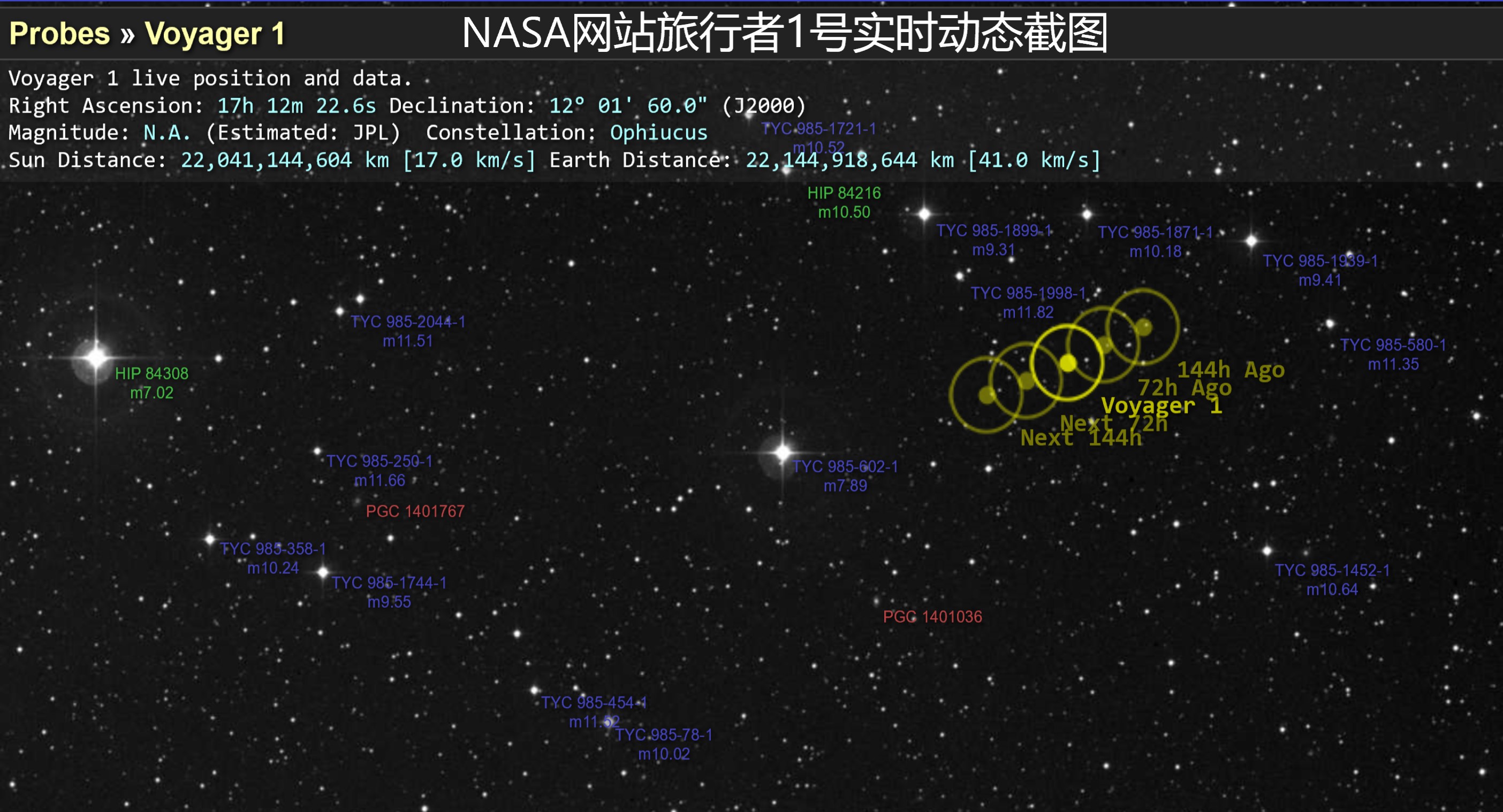 旅行者1号已经离开人类40多年了,截至现在,2019年11月7日北京时间21:22为止,距离太阳220.41亿千米,距离地球221.14亿千米(见上图)。