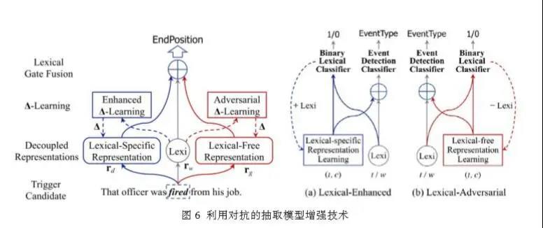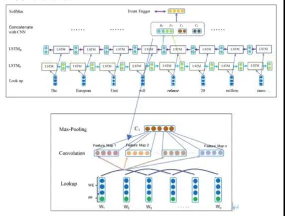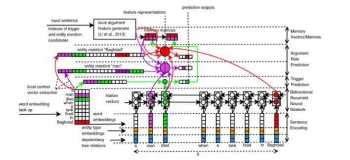 1 神经NLP基础 通常,我们在处理语言时,采用的基本手段可以用编码、计算和解码三板斧予以概括。 编码的目的是将语言符号转化为方便计算的数值化表示(也叫做分布式表示),比如将词投影到向量空间,形成一个向量表示。 计算的方式不善枚举,但在作用上可以粗略分为三种,第一种是对编码所得的数值化表示进行变形(深度学习过程中往往称为激活);第二种是演算(比如矩阵之间),借以实现信息融合、加权和交互等作用;第三种是参数求真,也就是训练中需要重点考虑的调参,包括数学模型本身的参数,以及人工设定的超参。 解码的任务是将计算所得的数值化表示转化为任务相关的记号。值得注意的是,如果将上述解码记号定义为目标语言序列,那么编码和解码过程就非常类似于seq2seq的学习过程(比如机器翻译过程);但将上述记号定义为类型标记,那么编码和解码过程实际上等价于分类过程。所以,解码的目标比较灵活,往往根据具体任务的需要进行设定。 将神经网络应用于NLP领域,也秉承了上述编码、计算和解码的基本处理思路,如果说有什么不同之处,无非是将这三板斧用神经网络予以实现而已。所以,大家最近最大的感受,似乎是NLP领域处处都“神经”。信息抽取也一样,因此也可以把这里的研究称为神经信息抽取(NIE)。 图1中给出了许多神经网络架构,其中,以卷积神经网络(CNN)和循环神经网路(RNN)为核心架构的NIE模型,在近十年的研究中陆续出现。除了直接将CNN和RNN在NIE上实现应用研究的案例,将许多有趣的元素融入其中的经验性研究也随之涌现,比如考虑借助框架语义(FrameNET)和AMR语义依存的神经表示学习策略。除此之外,注意力机制、对抗机制和交互机制也被陆续引入上述模型的扩展研究,并成为使之得以增强的重要保证。 图 1 神经网络结构纵览(未包含注意力机制 对抗机制、交互机制和图卷积等模型) 近期,为了获得更好的表示学习方法,以Transformer为基础的预训练模型已经成为神经NLP的必备良药(见图2),NIE的研究在2019年出现了结合BERT的相关工作。那么还有哪些除了强化学习尚未在NIE中全面铺开以外,神经网络的大部分模型在信息抽取(尤其是事件抽取)中几乎一一得以大显身手。举个系统的例子。比如,我们考虑用BERT的预训练模型进行词的初始化编码,其中就有了Transformer的影子;再向其中进行模型的细化,就会领教多头注意力机制、残差网络层、MASK门控和任务驱动预训练等有趣的方法。当然,如果以BERT及其子模型为基础,可能大部分现有的预训练模型家族都可以很容易理解。并且,值得应用性研究人员注意的是,就2019年的研究进展而言,除了BERT,大部分预训练模型家族成员(见图2)尚未在NIE领域得到应用与验证。 2 引神经事件抽取(Neural Event Detection) 事件抽取的目标是寻找句子中的事件触发词(比如attack)、论元(与触发词有关的名实体),以及论元角色(attacker还是victim)。其本质是词一级的分类任务,即将某个词或名实体划分到特定的事件类型、论元角色类型或普通的词类。因此,虽然输入模型的一条信息往往被指定为语句,但实际上事件抽取考虑的问题仍然是“这个词到底是什么”。所以,当看到ACE评测会议提供的大概40M左右(注:占磁盘空间的量)的秀珍数据集时(或者TAC-KBP提供的数据),请切勿低估其中的样本总量,原因在于每个词都是候选、都是样本。 根据这一任务定义,似乎只需要认知词义就可以形成有效的抽取方法。如果确信这一点,大家可以尝试单一地使用图2中的不同预训练模型构建抽取系统(NIE中预训练模型性能的全面检验尚未被报道过)。但是,在本报告中并不提倡这一做法,原因包括两个方面。其一,预训练的词向量被预先定义为语义空间中的一个点,这一定义并不完美,我们在这个报告的详细讲解中,尝试证明,词义在语义空间中实际上应该对应一个迷你的子空间;其二,虽然经过大规模数据的训练,但所涉猎的领域仍然有局限性,词义可以因为领域或主题的异同,有着较大的变化。上述两点可以用于解释现有预训练模型需要微调的原因。总之,我们建议预训练模型仍然只能用于计算词义的初始化表示,并结合其他神经网络模型,在编码、计算和解码过程中,形成解决特定任务(比如NIE任务)的专门模型。在事件抽取中也是如此,一个词到底是不是触发词、触发了什么事件、关联于何种名实体、唤起了何种角色,都需要结合局部甚至全局上下文、主题分布和语用特征进行联合处理。 下面将枚举几项有代表性的工作,包括CNN 和RNN的联合模型、传统策略与神经网络技术的过渡模型、生成对抗机制的应用模型。其他并未包含的模型请参考讲稿或宣讲PPT。 2.1 CNN 与 RNN 的结合 正如我们所知,CNN模型的提出来自于图像处理领域,因此本质上更适应图像的表示学习,RNN因其循环计算,在处理诸如语言的符号序列方面有着不俗的表现。那么,将两者结合是否可行?Feng等在2016年利用CNN和RNN构建联合模型,并应用于事件抽取。 图3给出了这一模型的总体架构,其核心操作集中在编码阶段。值得首先提示的是,这一模型并未执行双重编码(融合),而是完成了不同编码特征的合并(拼接)。其中,集成了长短期记忆单元的双向RNN(Bi-LSTM)对输入语句中的每个词进行了编码,理想情况下,这一编码过程能够将远距离依赖的上下文信息代入当前词义的表示学习;CNN则独立地执行了另一
