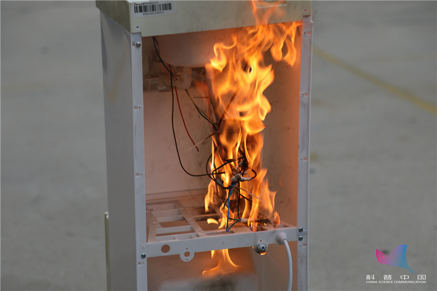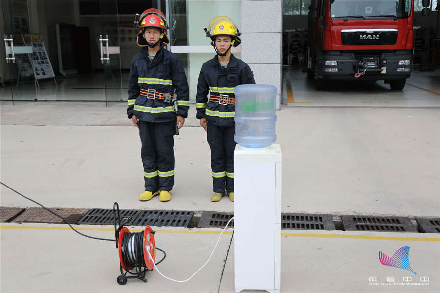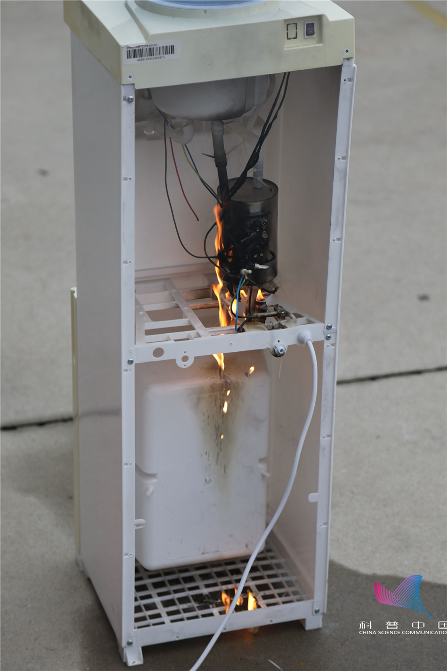 连云港市消防救援支队特勤中队的消防队员做了一组实验,证实饮水机在使用不当的情况下真的会着火。