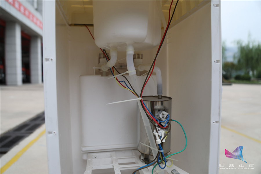 消防队员找来了一款普通饮水机,并准备了插排、测温仪等辅助道具。为了更方便直观地看到饮水机内部的变化,实验人员将饮水机的后盖进行了拆卸。