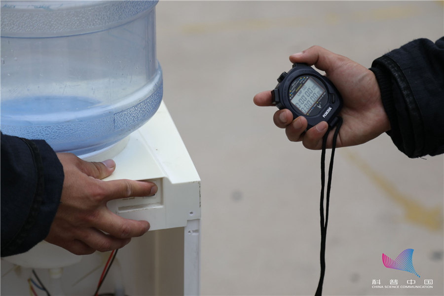 实验人员看到饮水机的电源一直在亮,说明饮水机在没有水的情况下依然在工作。实验人员用手触摸一下,发现饮水机的加热内胆特别烫。用测温仪测试,发现在很短的时间内,加热内胆外表的温度就上升到了150度。