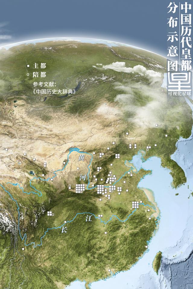 ▽中国历代皇都分布图,注:一个方块代表建都一次| 制图@陈志浩&张靖/可视化星球