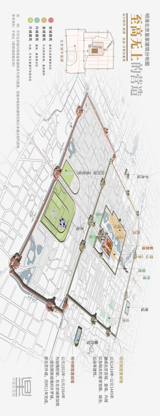 ▽北京明清北京皇家建筑分布图,注:今天北京城内明清皇家建筑多为清代重建,但基本格局和建筑形制大多遵从明代原物,请横屏观看| 制图@张靖/可视化星球