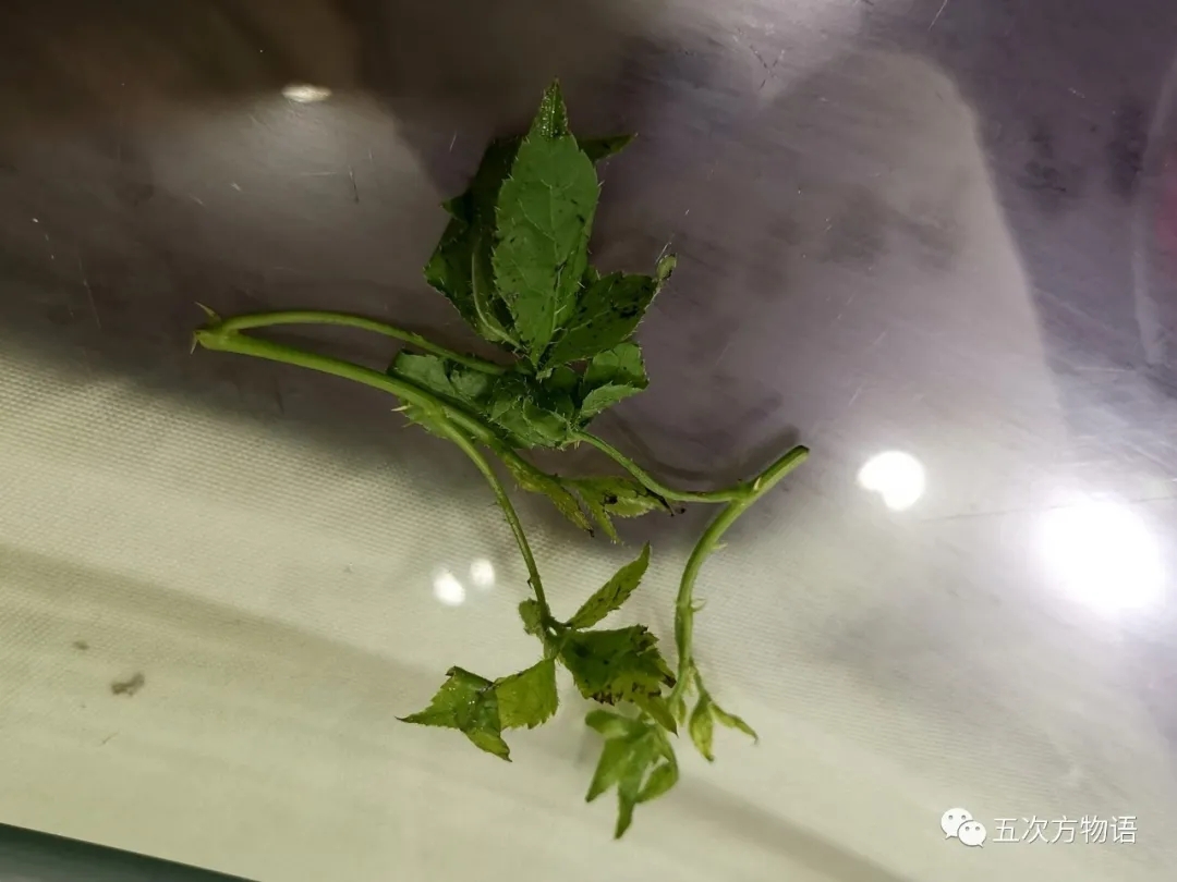 吃完之后溜达到后厨探秘,又发现了一种完全摸不着头脑的野菜,看上去毛毛扎扎的,似乎无处下嘴。这到底是什么植物呢?叶子的形态为掌状复叶,小叶或3或5,以一般常识来判断,似应属于五加科。当时向店员询问,伊甩给我三个字转身离去,但我没听懂;后来几经回忆、反复揣摩,为之“辗转反侧,寤寐思服”,感觉伊说的像是----刺五加。