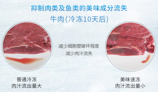 虽说是温度波动,但温度和食材之中还有一个媒介,就是上面提到的水分。水分密布于食材的各个角落,当温度降低,水份也会在食材内部结冰,如果此时温度波动较大,加上长期储存,就会为冰晶的“长大”提供条件,继而导致冰晶压迫细胞壁,使食材内部受损,影响食材的硬度、弹性,并导致营养流失。最直观的表现就是在解冻肉类时流出大量血水。