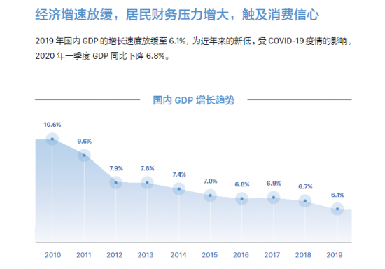 根据国家统计局发布的国内GDP增长趋势图,2020年一季度GDP同比下降6.8%,疫情期间外出的减少,收入的下降,财务压力的增大,多种因素的共同影响下,是的市场上的消费意愿降到冰点。